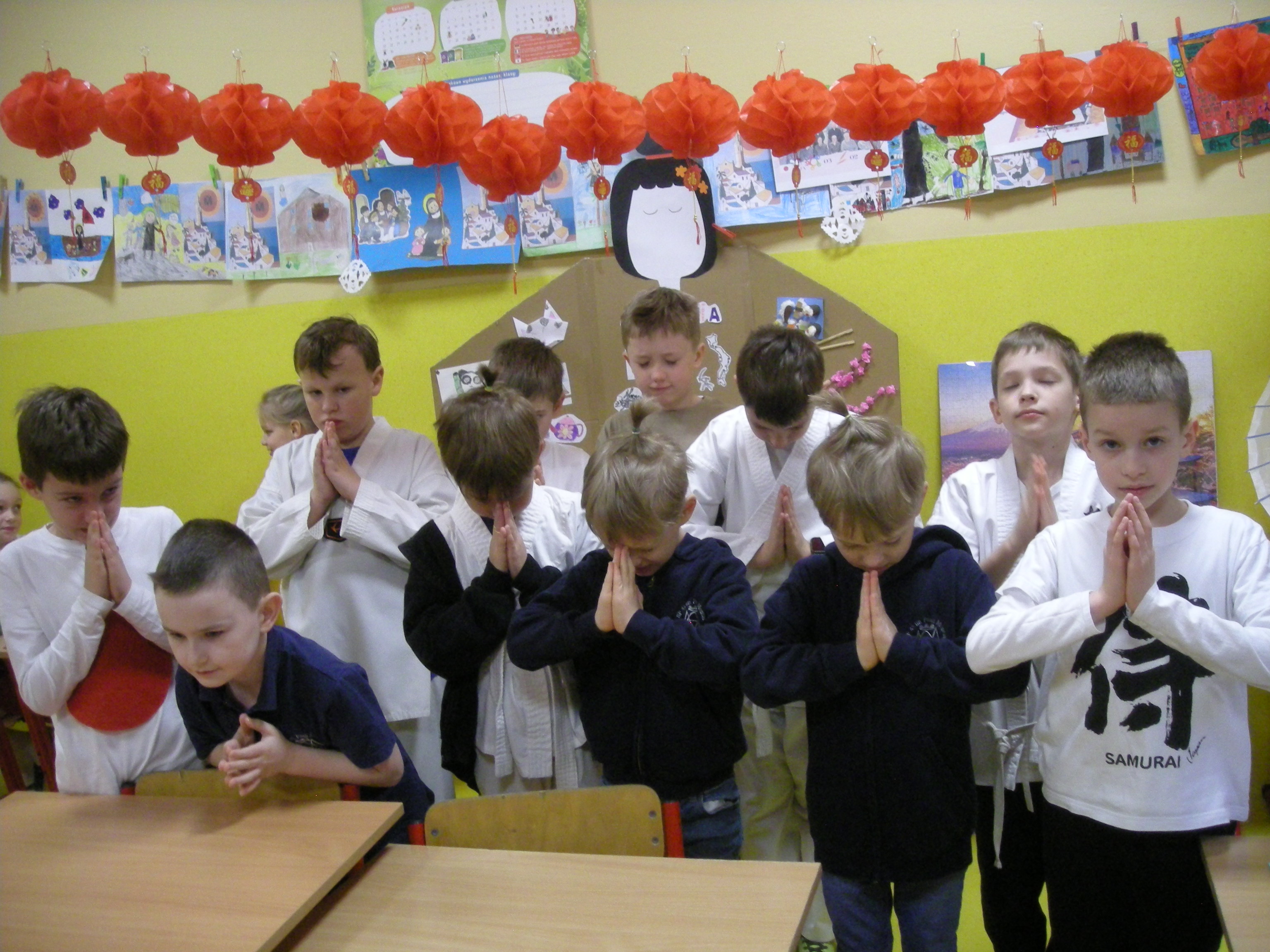 W ramach przygotowań do uroczystości zajęliśmy się dekorowaniem sali. Ku naszej wielkiej radości wylosowaliśmy Japonię. W sali pojawiły się gałązki kwitnącej wiśni, papierowe zwierzątka wykonane techniką origami oraz tekturowa Japonka.